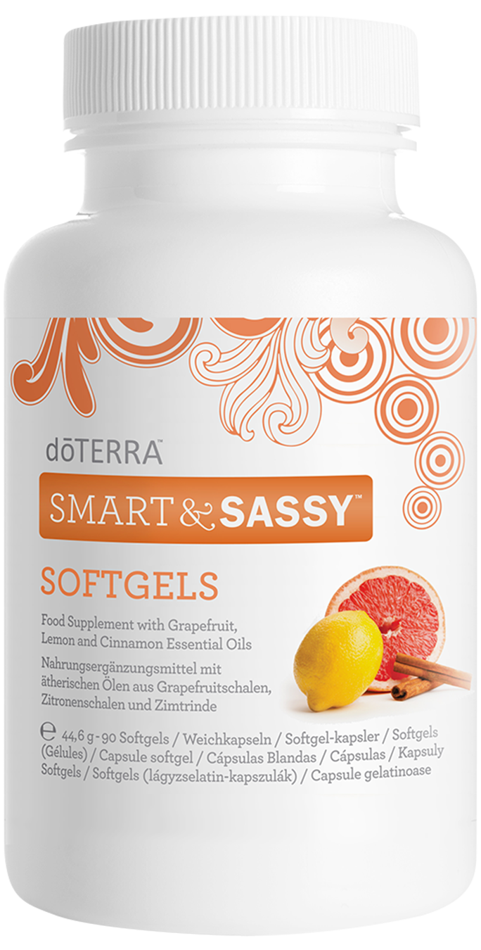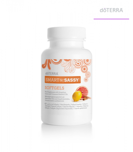 Prawnie zastrzeżona aktywna mieszanka doTERRA Smart & Sassy w postaci wygodnych kapsułek. Mieszanka zawiera olejki eteryczne z grejpfruta, cytryny, mięty pieprzowej, imbiru i cynamonu. Kapsułki Smart & Sassy doskonale sprawdzają się w podróży lub w przypadku osób, które potrzebują łatwego sposobu spożywania mieszanki olejków eterycznych doTERRA Smart & Sassy.